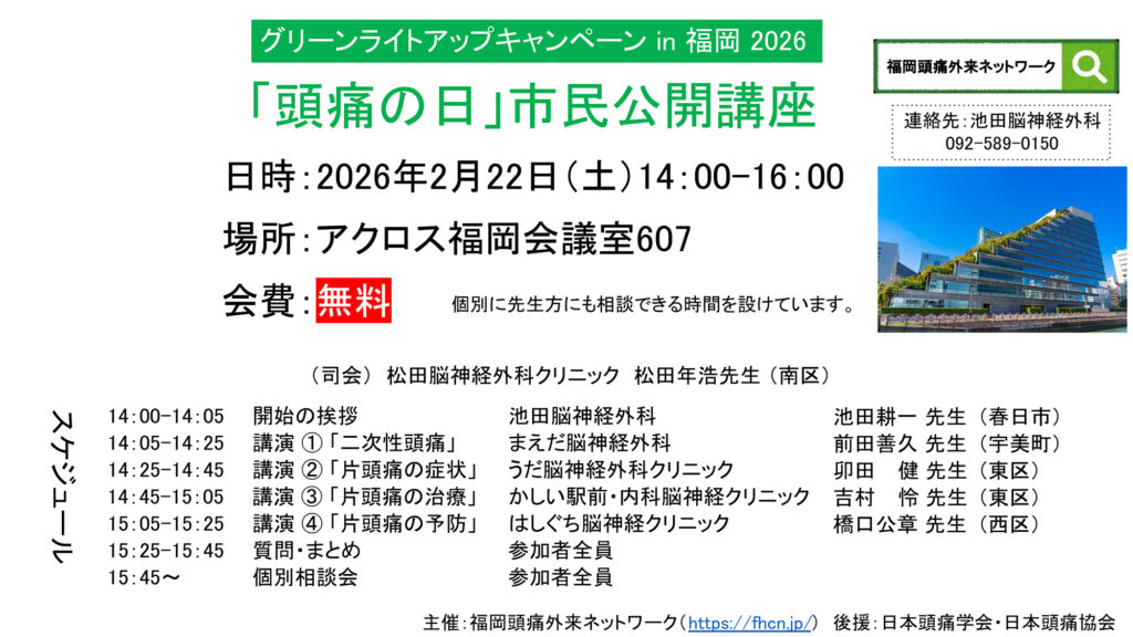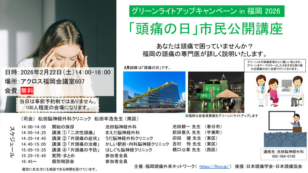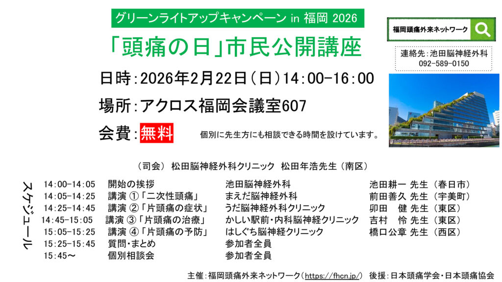 グリーンライトアップキャンペーン in 福岡 2026「頭痛の日」市民公開講座を開催(2026年2月22日)