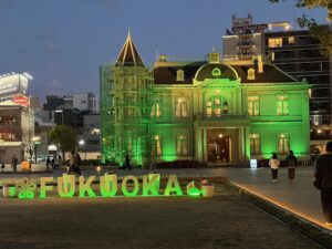 18時頃から、旧福岡公会堂貴賓館も緑色にきれいにライトアップされました。